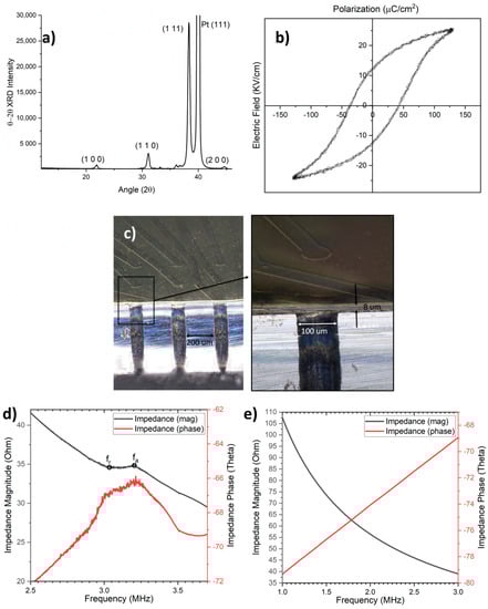 (a) XRD of the PZT. (b) P−E hysteresis loop of the PZT. (c) High−resolution optical microscope image of the high-frequency PMUT array membranes with 6 µm polyimide and 1 µm PZT. Zoomed−in view to the right. (d) The impedance of the single PMUT showing resonance (fr) and antiresonance frequencies (fa). (e) The impedance of the single PMUT underwater.