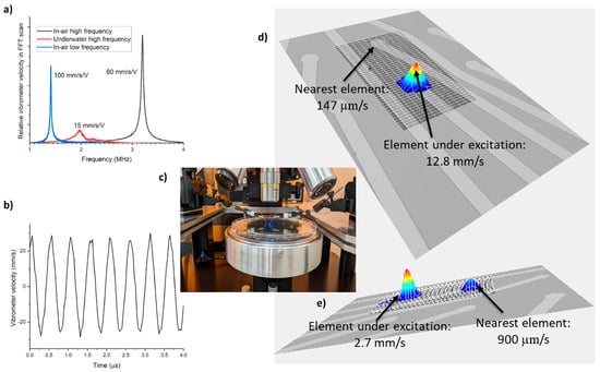 The fabricated device was characterized in air and in DI water using a laser Doppler vibrometer (LDV). The in-air resonance frequency was recorded using periodic chirp excitation as 3.2 MHz (Figure 6a) with a transmission sensitivity of 60 mm/s/V. As demonstrated in the device design and simulations, the resonance frequency of a PMUT element can be controlled with the polyimide thickness. To experimentally demonstrate this, another array is fabricated with 3 µm thick polyimide, showing a resonance frequency of 1.4 MHz in the air with a higher sensitivity of 100 mm/s/V (Figure 6a). The measurements of eight PMUTs selected from this array show a small center frequency mismatch of 20 kHz (~1.5%), demonstrating good fabrication uniformity. Moreover, LDV studies can also be performed in liquid mediums, as demonstrated by several other studies on PMUTs [28,29]. Underwater, the resonance frequency and sensitivity dropped to 2 MHz due to medium damping (Figure 6a). The underwater sensitivity of the PMUT element is around 15 mm/s/V at 2 MHz, and this value was measured with sinewave excitation in a time-domain experiment (Figure 6b).