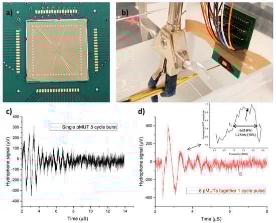 The next measurements involved pulse characterization of the PMUT device underwater with a hydrophone (1 mm needle, Precision Acoustics). For this measurement, the PMUT array was glued to the PCB with epoxy (Figure 7a) and then wire bonded to the PCB. Bond pads along with the bond wires were sealed with epoxy. Figure 7b shows the setup for the hydrophone measurements. The hydrophone was aligned with the PMUT to obtain the maximum signal. However, while aligning, we ensured that the measurements were in the far field. The near field distance can be calculated as a2/λ and is about 3 µm, where a is the PMUT element radius and λ is the wavelength of the propagating ultrasound wave. Even if the array aperture is considered with a 1 mm radius, the distance is about 1 mm, ensuring the measurements are far field. The actuation amplitude was set as 20 Vp−p. Square wave pulses at 2 MHz were applied with the HMF2525 function generator (Rohde & Schwarz) in this experiment. This signal generator can provide pulses up to 12.5 MHz with a rise time as small as 8 ns. Moreover, the hydrophone used has a flat response in the bandwidth of 15 MHz starting from 200 kHz. The case where the oscilloscope was used was similar. These suggest that the bandwidth of the acquired signal depends only on the drive signal and our PMUT transducer whereas the instrumentation is close to ideal. Hence, the true bandwidth can be calculated by deconvolving the acquired signal from the drive signal.
