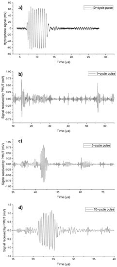 Lastly, to measure the receive sensitivity of the PMUT transducer, a single-element wide-band transducer (Precision Acoustics, UK) was used to transmit a burst signal at 2 MHz. The transmitted signal was measured by the calibrated hydrophone and the PMUT transducer. The measured hydrophone signal (Figure 8a) amounted to a 73 kPa pressure. Figure 8b–d show the received signal of eight PMUTs connected in parallel in response to 1, 5, and 10-cycle sinusoidal burst signals, respectively. Since the same pressure levels were applied to the PMUTs (by maintaining the same distance and applied burst signal level), the receive sensitivity was calculated by dividing the voltage signal in response to the 10-cycle burst by 73 kPa pressure, and a receive sensitivity of about 15 mV/MPa was obtained for the PMUTs. This receive sensitivity was found to be on the lower side because of the high parasitic capacitance of the PMUT interconnects. Note that the pulse response of the single-element transducer utilized in this experiment is not short and has some ringing. However, a very similar response was captured by the PMUT channel and hydrophone, again a confirmation of the wide bandwidth demonstrated by this technology.