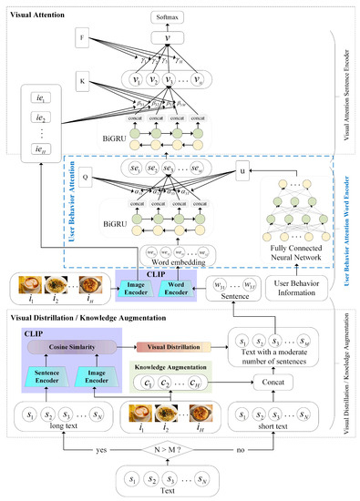 Our UsbVisdaNet model is entirely based on improvements to the VisdaNet [29] model. The architecture of UsbVisdaNet consists of four hierarchical layers, as illustrated in Figure 2. The proposed model, UsbVisdaNet, is comprised of four layers, each with a specific function. The first layer, situated at the bottom, functions as a visual distillation and knowledge augmentation layer, addressing the challenge of information control during multimodal fusion in product reviews. The visual distillation module compresses lengthy texts to eliminate noise and improve the quality of the original modalities. In contrast, the knowledge augmentation module incorporates image descriptions and short text to enrich short text information, compensating for the limited information present in short texts. The second layer is the word encoding layer with user behavior attention, which converts features from the word level to the sentence level. The third layer is the sentence encoding layer, which addresses the challenge of integrating multiple images with a single text in the context of product reviews by incorporating visual attention mechanisms based on CLIP [30]. This approach is used to transform sentence features into features for the entire comment. The top layer is a classification layer used to calculate the sentiment labels of user reviews. To avoid redundancy, we will not reiterate the parts that are the same as VisdaNet in this section; instead, we will focus on the differences and improvements compared to VisdaNet in the remaining parts of this section. Next, we will offer a more elaborate explanation of the design specifics for every layer.