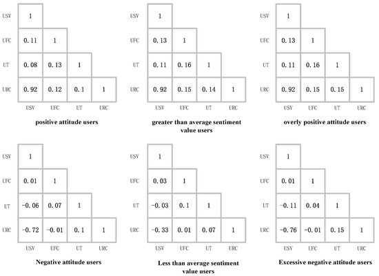Results of calculating the correlation coefficient between “user review count (URC)”, “user tenure (UT)”, “user friends count (UFC)”, and “user sentiment value (USV)”.