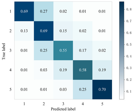 We conducted experiments on the Yelp multimodal dataset to compare the performance of our proposed model with the sentiment classification baseline methods mentioned earlier. Accuracy was used as the evaluation metric. Table 6 displays the structural characteristics of each method. The experimental results, which are presented in Table 7, indicate that our proposed UsbVisdaNet model outperforms the other methods in terms of average accuracy. Our model achieved an accuracy that is about 5% higher than GAFN. Furthermore, our model outperformed the previous state-of-the-art (SOTA) model, GAFN, achieving the highest accuracy performance on the Los Angeles dataset, with an accuracy approximately 7% higher than that of GAFN. The model’s predictive performance on different ratings can be seen in the confusion matrix of UsbVisdaNet on the test dataset, which is presented in Figure 6.