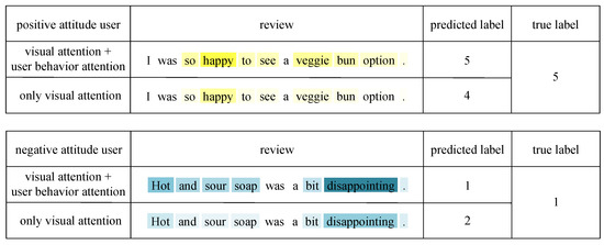 The results are depicted in Figure 7, where it should be noted that the degree of color darkness correlates with the weight magnitude. For reviews written by users with a positive attitude, we observed that the word “happy” was assigned a higher attention weight after incorporating user behavior attention, resulting in a prediction closer to the true label. This may be because users with a positive attitude tend to give higher ratings even if the text of the review does not seem particularly favorable. Similarly, for reviews written by users with a negative attitude, we observed that the word “disappointing” was assigned a higher attention weight after incorporating user behavior attention, resulting in a prediction closer to the true label. This may be because users with a negative attitude tend to give lower ratings even if the text of the review does not seem particularly critical. Our model not only effectively captures the biased user features but also generates accurate predictions. The visualization of user behavior attention indicates that our model can identify positive and negative users and improve classification results by accounting for user bias through the incorporation of user behavior information.