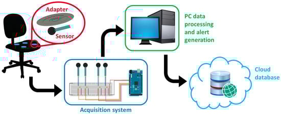 Figure 3a shows the sensors coupled to the 3D printed plastic adapters and the acquisition system, and Figure 3b shows the prototypal system in operation, where the sensors are placed in the cushion, and the acquisition board is connected to the workstation running the software program. During normal operating conditions, the acquisition system is housed inside a dedicated plastic box placed under the chair seat, and only the USB cable connects the chair to the PC.