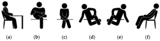 Figure 4 shows a collection of postures, one of which is well balanced (Figure 4a), and the others are detrimental to the spine health (Figure 4b–f) and trigger the asymmetric posture warning.
