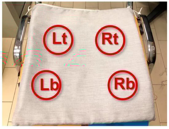 Pressure sensors’ positioning into the cushion. The four sensors are identified by Lt (Left-top), Rt (Right-top), Lb (Left-bottom), Rb (Right-bottom).