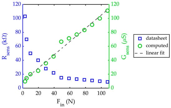 The sensors inside the cushion are four commercial force sensing resistors (FSR) DF9-40, cheap and well-performing. The sensors are made of a pressure-sensitive nanocomposite layer, which is a nanoparticle-filled polymer that, when pressed with an increasing applied force, increases the active conductive paths so that the overall resistance decreases. Thus, the sensor resistance Rsens inversely depends on the applied force Fin, and the sensor conductance Gsens = 1/Rsens is approximately linear across the measurement range, as shown in Figure 6. The analytical relation between Gsens and Fin obtained by linear fitting of the calibration curve is: