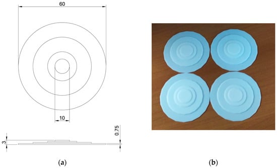 Due to the very small sensitive area of the chosen sensors, we had to make some adapters to scale the force application surface down to the active area of the sensors. These adapters are made of poly-lactic acid (PLA) and realized by 3D printing superimposed circular layers with decreasing area. Figure 7a shows the design of the adapters and Figure 7b presents the fabricated disks. The PLA disks are then coupled to the four sensors and put on the lower side of the cushion, facing the chair seat.