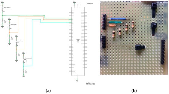 The read-out from the sensors is performed by acquiring the voltage on a known resistance in a voltage divider configuration with the sensor, digitalized by the 10-bit ADC of an Arduino® (Arduino, Turin, Italy) Mega microcontroller board, and transformed into a force value according to Equation (1). Figure 8a reports the acquisition system schematic, and Figure 8b shows a picture of the acquisition circuit board.