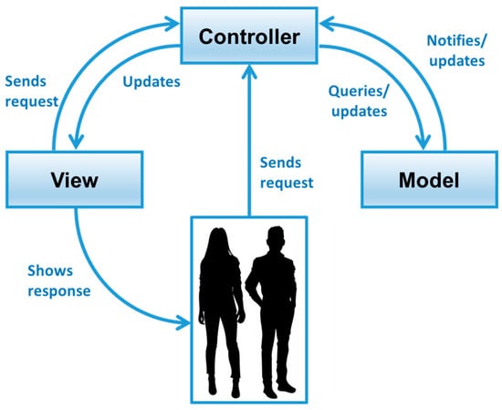 The asymmetry detection and notification software is a Java-based multiplatform program designed according to a model-view-controller (MVC) architectural pattern. According to this pattern, the user interacts with the controller (i.e., the code managing the data flow) by providing the input force applied on the sensors and by operating the graphical user interface (GUI). The controller queries the model (i.e., the acquired data processing code) to retrieve the output of the measurements and the result of the detection algorithm. The model updates the controller by sending the elaborated data, hence providing the current status of the sensors and the symmetry/asymmetry of the posture. The controller also provides the data needed to inform the user about their current weight distribution on the smart seat to the view (i.e., the visualization of the current sensor status on the GUI). Figure 9 summarizes the interactions between the three actors of the MVC architectural pattern.