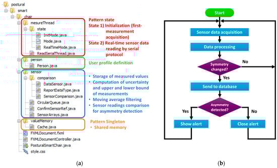 (a) Description of the software implementation: The code structure is reported, highlighting the function of each section of the project. (b) Workflow of the posture monitoring software.