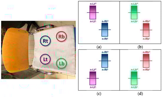 The sensors are placed under a 1 cm thick foam layer of square shape with a 40 cm side in top-left (Lt), bottom-left (Lb), top-right (Rt), and bottom-right (Rb) positions. The cushion protects the sensors and hides them from the user. The sensors’ positioning is sketched in Figure 5.