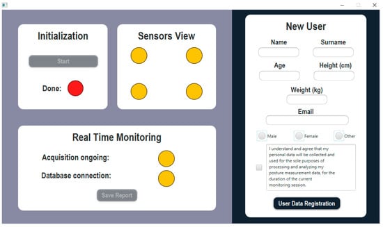 Figure 13 shows the GUI of the software developed for the posture monitoring system. When the software is launched, the user fills the ‘New User’ tab on the right to register their personal information in the database. In accordance with the personal data management regulations, the user is also asked to check the box for consent to the collection and use of their personal data limited to processing and analyzing the posture measurement data for the duration of the starting monitoring session.