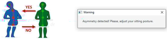 When the shift from a symmetric position to an asymmetric position is detected, the system generates a pop-up message like the one shown in Figure 14. After the user adjusts the position improving the balance of the force distributed on the smart seat surface, and the shift from the incorrect position to the correct position is detected, the warning message closes autonomously. This alert generation and closing feature worked correctly during the asymmetry detection algorithm testing.