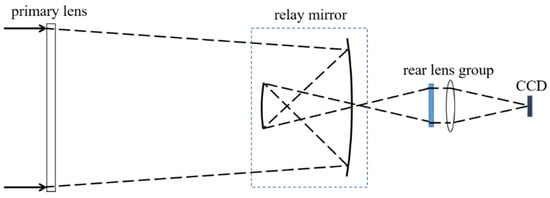 We take a long focal length diffraction imaging optical system as an example; the schematic diagram of the telescope optical system is shown in Figure 1. The diameter of the primary lens is 1 m, the primary lens is a plane, and there are annular microstructures prepared on the surface so that the light can converge on the relay mirror. The relay mirror is 300 mm in diameter, and the relay mirror and the rear lens group are fixed in a frame. The relay mirror is used to fold the optical path and shorten the total length of the system. The rear lens group is responsible for correcting aberrations and providing the final image. The primary lens is extended to the right place by trusses, and the distance between the primary lens and the relay mirror is about 3 m. In order to ensure the imaging quality of the telescope, the Modulation Transfer Function (MTF) @62.5 lp/mm should be up to 0.1. To meet the MTF requirement, the system needs to have good optical quality in terms of resolution, contrast, and uniformity. The MTF is a measure of the ability of the system to transfer contrast from the object to the image, and it depends on many factors, such as the aperture size, aberrations, and diffraction effects, which is a challenging requirement for a system with such a long focal length. Defocus tolerance is important for maintaining the focus of the system over time and under different environmental conditions. The focal depth is proportional to the square of the aperture diameter and the wavelength and inversely proportional to the focal length. Therefore, the defocus of the system should be less than 1/4 focal depth during the whole life cycle [24]. In summary, the long focal length diffraction imaging optical system requires careful design and manufacturing to achieve high MTF and low defocus tolerance. The use of annular microstructures, relay mirrors, and rear lens groups are effective ways to improve the optical performance of the system.