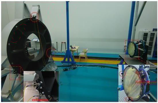 In order to verify the pose measurement method and its accuracy, an experimental system was built, as shown in Figure 5. For convenience, a frame was used instead of the primary lens of the telescope and its center was aligned with the center of the relay mirror. At the same time, the frame was fixed to a high-precision hexapod platform to provide an accurate reference pose. Three retroreflectors were attached to the edge of the frame. In addition, six laser collimators were fixed to the edge of the relay mirror and connected to the laser rangefinders by six fibers. Each retroreflector and collimator weigh only about 20 g, which makes the overall measurement system very light and flexible.