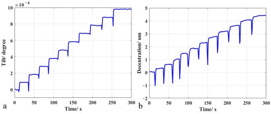 Test results of 1 × 10−4 degrees and 0.4 μm step test of the measurement system. (a) The tilt error of the measurement system is 2 × 10−5 degrees, (b) The decentration error of the measurement system is 0.2 μm.