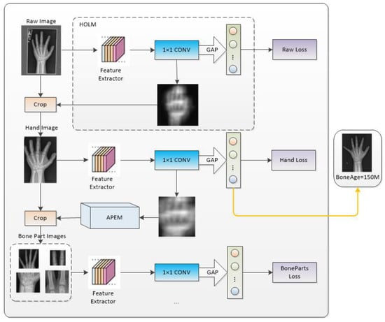 As shown in Figure 1, the proposed MAAL-Net has three branches in the training stage: the raw image branch (Branch 1), the hand image branch (Branch 2), and the bone part images branch (Branch 3). Through the collaborative learning of these three branches, the network achieves a good classification ability for different scales and parts of objects as well. In the test phase with repeat experiments, Branch 2 achieves the best performance. Accordingly, we use Branch 2 as the final prediction output. Two modules are included among the three branches. One is the hand object location module (HOLM) to predict the position of the hand object, and the other is the attention part extraction module (APEM) to extract the ROIs with the most information of the hand object without using bounding-box annotations. Specifically, HOLM uses the whole image as input and generates the hand object that covers the most discriminative regions. This image is then used as the input of APEM to further crop bone part regions for training.