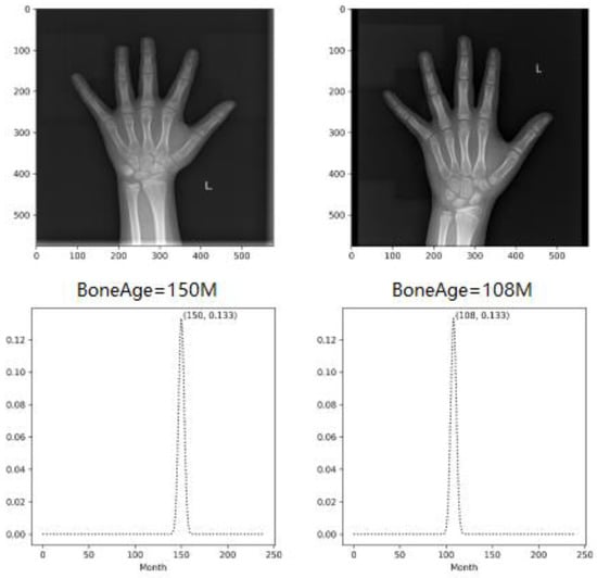 Human growth and development have an objective judgment standard, i.e., bone age, except for physical age. The early diagnosis of growth and development anomalies in teenagers based on bone age can not only estimate growth but also detect potential endocrine diseases, thus allowing intervention measures to be adopted timely [,]. Bone age assessment (BAA) is usually implemented by radiologists by examining left-hand X-ray images. Currently, the most common manual methods are Greulich–Pyle (GP) atlas and Tanner Whitehouse 2 (TW2) scoring method. For the GP atlas method [], doctors determine bone age by searching the standard reference image set for the most similar image to the X-ray image of the patients’ hand. The TW2 method [] recognizes the specific regions of interest (ROIs) of wrist and finger bones, then scores each ROI according to development degree, and finally combines the scores to calculate bone age. However, both the GP atlas and TW2 scoring methods suffer from some limitations in BAA. First, these two methods have strong subjectivity and are easily interfered by doctors’ subjective judgment. Moreover, they involve high requirements on professional levels of doctors, and bone age can be determined accurately only if provided with long-term training and experience. Lastly, both methods are time- and labor-consuming. Currently, the GP atlas is the preferred method because the TW2 method requires determining the grade of each RoI, which increases the workload of physicians.
