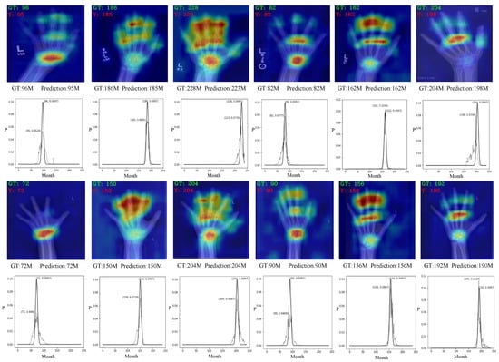We further perform a visualization experiment to effectively and intuitively understand the proposed method. Heat maps generated by Grad-CAM [] on input images are shown in rows 1 and 3 of Figure 3. The peaks of heat maps indicate that the important features are mainly concentrated in the most distinctive parts, such as the carpal and phalanges. For young children, the important features are concentrated on the carpal rather than the phalanges, as shown in columns 1 and 4 in Figure 3. For teenagers and those in late adolescence, important features are concentrated at the carpal and phalanges, and the features of the carpal are stronger than those of the phalanges, as shown in columns 2, 3, 5, and 6 in Figure 3. These findings are consistent with prior knowledge of experts for BAA. Therefore, the proposed method allows us to learn and establish accurate knowledge without prior knowledge of experts. Furthermore, we provide the distribution curves of the predicted output and ground-truth labels as shown in rows 2 and 4 in Figure 3. As we can see, most of the prediction and ground-truth label distribution curves have very strong consistency. important features are concentrated in the wrist and toe bones, but the features of the wrist bones diminish while those of the toe bones increase, as shown in columns 2, 3, 5, and 6 in Figure 3.