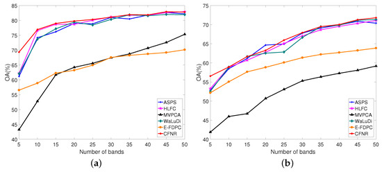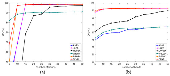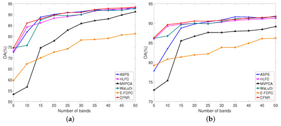 1. Principal findings and comparison with other studies. CFNR is compared with ranking and clustering-based band selection methods. The experimental results in Figure 3, Figure 4, Figure 5, Figure 6 and Figure 7 reveal that the ranking and clustering-based methods exhibit relatively poor performance when the number of selected bands is small. This finding implies that it is considerably difficult to use fewer bands and provide sufficient information. In addition, as shown in Table 8 and Figure 3, Figure 4, Figure 5, Figure 6 and Figure 7, most clustering-based methods outperform ranking-based methods. The presumed reason is that the ranking-based band selection methods are typically based on a single criterion. These findings are consistent with those of previous studies [46,47]. Moreover, as shown in Figure 3, Figure 4, Figure 5, Figure 6 and Figure 7, the OA values of all methods increase with the increasing number of bands, but the rate of increase becomes progressively slow. This is because as the number of selected bands increases, more feature information is included in the representative bands, thereby increasing redundancy [48].
