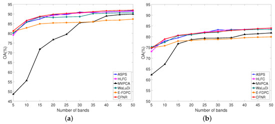 Two classifiers, namely linear discriminant analysis (LDA) [43] and support vector machine (SVM) [44], which adopts the radial basis function as the kernel function, are employed in the experiments to test the performance of the proposed methods. The proposed method is then compared with five representative band selection methods, comprising the clustering-based methods WaLuDi, E-FDPC, ASPS, HLFC, and the classical ranking-based method MVPCA. All the methods were implemented using MATLAB 2016b and executed on a computer using the Windows 10 operating system and Intel Core i7-9700K 3.60 GHz CPU.