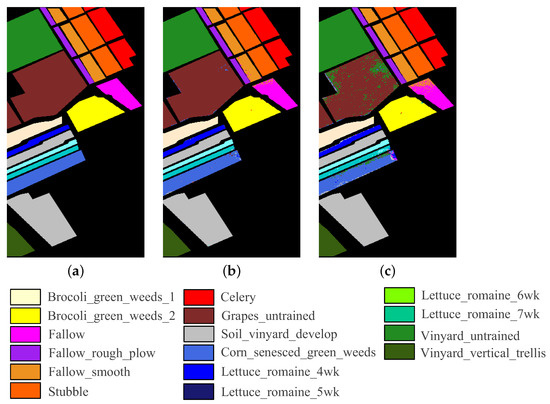 The Salinas dataset comprises data obtained by the AVIRIS sensor over the Salinas Valley in California, USA. The size of images in the Salinas dataset is 512 × 217 pixels with a spatial resolution of 3.7 m. A total of 204 bands were retained in the experiments after removing noisy and uncalibrated bands (108–112, 154–167, and 224). This dataset contains 16 identified classes.