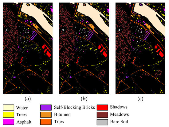 The Pavia University dataset was acquired by the ROSIS sensor over the University of Pavia in Italy. The size of the images in this dataset is 610 × 340 pixels with a spatial resolution of 1.3 m, 115 spectral bands, and 16 classes. A total of 103 bands were retained in the experiments by excluding 12 noisy bands.