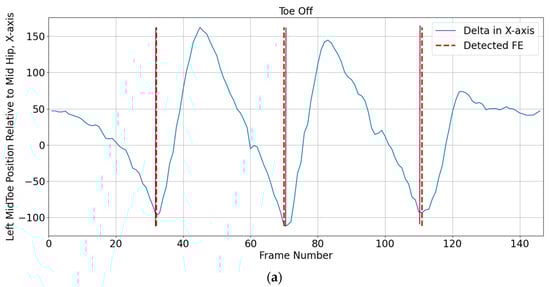 Foot strike and foot-off events were determined using the Zeni et al. [] method. According to this approach, heel strike is when the sacral marker’s forward distance from the heel marker is at its maximum, and toe off is when the toe marker is furthest posterior from the sacral marker. Since sacrum keypoints are not provided in OpenPose, the midhip keypoint (KP8) was used to replace the sacral marker location. Figure 2 provides an example of identified foot strikes and foot off using the heel positions (KP24 and KP21) and midhip positions (KP8).
