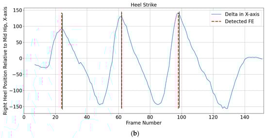 Identification of heel strike and toe off for right leg (a) midtoe position, (b) heel position. Solid black line represents actual foot event frame, and dashed red line is estimated foot event. FE = foot event.