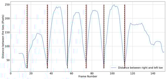 The distance between the toes (KP19 and KP22) is used to determine mid-midstance and mid-midswing. The legs are closer together in mid-midstance posture; hence, the space between the two toes will be less. Assuming that the right big toe (KP22) is (, ) and the left big toe (KP19) is (, ), the distance between toes (d) was calculated using Equation (1), and mid-midstance was at the minimum distance (Figure 3):
