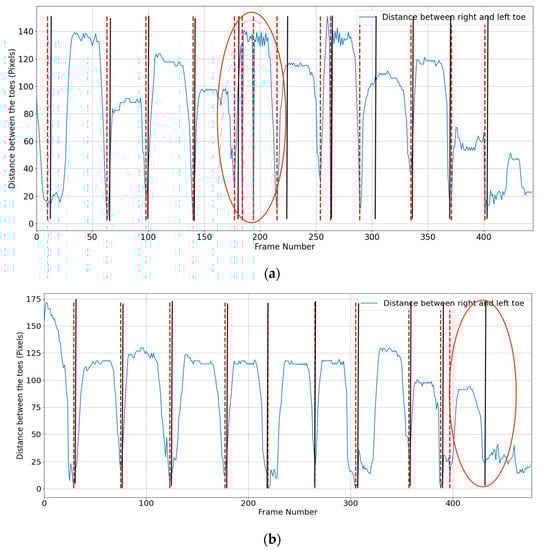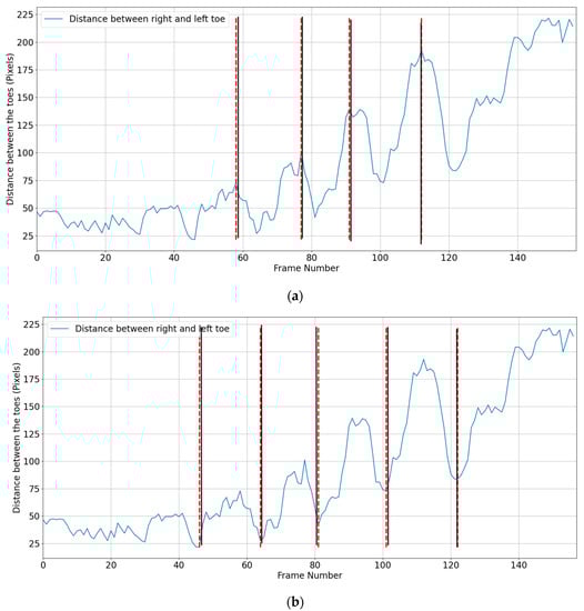 Distance between the toes during a walking trial: (a) heel strike and (b) mid-midstance. The red dashed line is algorithm’s estimated mid-midstance and heel strike. Solid black lines are ground truth for mid-midstance and heel strike.