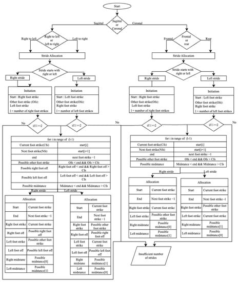 The process involved determining if the video is in the sagittal or coronal plane; determining whether the motion is left to right, right to left, anterior to posterior, or posterior to anterior; detecting the four distinct gait events; and assigning values to a particular stride. The required events are foot strike, foot off, mid-midstance (midpoint of midstance) and mid-midswing (midpoint of midswing).