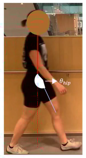 The majority of EVGS parameters need angle calculations, including hip, knee, and ankle. Hip angle in the sagittal plane was computed using the angle between the axis perpendicular to the trunk axis and the thigh axis (Figure 6), Since OpenPose does not provide keypoints for a pelvis segment. The trunk axis was the axis between the midshoulder (KP1) and midhip (KP8) keypoints. The line connecting the hip (KP9 and KP12) and knee (KP10 and KP13) keypoints was the thigh axis. Note that this is different from how people can visualize hip angle, which is usually the thigh angle related to pelvis orientation. Equation (2) was used to calculate the slope
