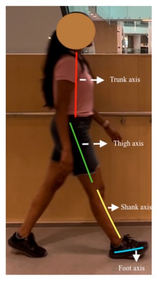 A similar procedure was followed for the thigh axis, where was calculated from (,), which corresponds to the hip’s coordinates (KP9 and KP12), and (, ) represents the knee keypoints (KP10 and KP13):