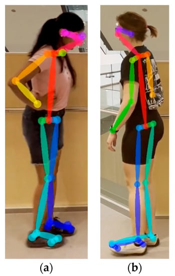 Similar to the foot position approach, a line from the midshoulder (KP1) to the midhip keypoint (KP8) was used for trunk angle. The angle between this trunk line and the x-axis of the image coordinate system in the sagittal plane was calculated. Then, in accordance with the EVGS handbook [], normal (vertical to 5° forward or backward), abnormal (greater than 5° backward or between 6° and 15° forward), and highly abnormal (more than 15° forward) conditions were classified.