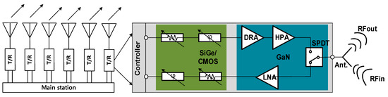 - Rocco, G.; Sergio, C.; Walter, C.; Ferdinando, C.; Giorgio, P.; Alessandro, S.; Marco, V.; Manuela, S.; Maurizio, C.; Ernesto, L. S-Band GaN Single-Chip Front End for Active Electronically Scanned Array with 40-W Output Power and 1.75-dB Noise Figure. IEEE Trans. Microw. Theory Tech. 2018, 66, 5696–5707. [Google Scholar] [CrossRef]