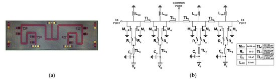In this work, we implemented two types of SPDT T/R switches. The first T/R switch (SW-A) employs shunt inductors to compensate parasitic capacitance of shunt transistors to improve isolation and bandwidth. The second T/R switch (SW-B) is more focused on the low insertion-loss, which excludes the shunt inductors. SW-A is advantageous in achieving a wider bandwidth with improved isolation owing to the resonant inductors. However, the additional lossy inductors degrade the overall insertion loss of the switch. Figure 3 depicts the layout and the schematic of SPDT T/R switch version-A (SW-A). The designed T/R switch occupies a chip size of 5.7 mm × 1.5 mm. The proposed T/R switch has a symmetric structure, and each arm consists of four parallel HEMTs with transmission lines without any series HEMT switches. The simulations have been conducted in Keysight ADS, and all the routing lines in the design were optimized with the Momentum EM simulator in ADS. The size of all shunt transistors is optimized to achieve the minimum insertion loss while providing good isolation and linearity. When the Tx path is turned on, that means M1–4 should be turned on to make a short circuit, which is consequently seen as open by the transmission line, TL1. Thus, M1–8 need to be large enough to minimize the on-state resistance. Considering these aspects, the width of M1–8 is 9 × 100 μm.