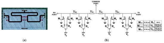 The chip photo and the schematic of SW-B are presented in Figure 4. Different from SW-A, SW-B removes the parallel inductors to improve the overall insertion loss. The designed SW-B occupies a chip size of 5.3 mm × 2.6 mm. To reduce the parasitic capacitance, the widths of M1,8 and M2,3,6,7 are changed to 5 × 100 μm and 7 × 100 μm, respectively. Meanwhile, the width of M4,5 remained at 9 × 100 μm to guarantee the small channel resistance with a T/R switch off-state. Different from SW-A, a gate resistor Rg = 500 Ω was adopted for the isolation purpose, and the degradation due to the voltage drop was not measured as described the Section 3.1.
