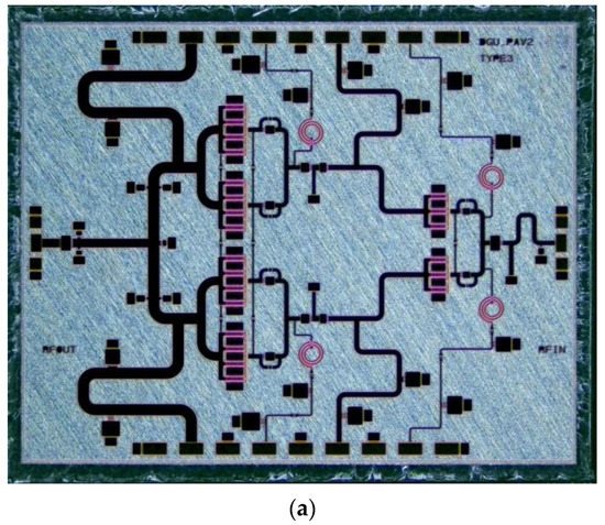 A two-stage driving amplifier (DA) with high power gain is used to drive the HPA at the saturation point with optimal peak power added efficiency (PAE). Figure 8 illustrates the chip photo and the schematic of the proposed amplifier. The size of the implemented DA is 4.4 mm × 2.8 mm. Since the designed power amplifier in Section 2.2 necessitates an input power of 32 dBm to achieve the saturation point, the DA should acquire an output power larger than 32 dBm.