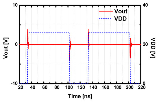 Theoretically, Rollet’s k-stability analysis can be usefully applied to check the unconditional stability of the two-port network at the small-signal regime. Unfortunately, a realized HPA cannot be properly modeled as a two-port network since it includes multiple biasing ports. Hence, oscillations may not be properly detected only with the k-stability test from the small-signal two-port S-parameters. To guarantee the stability of the designed HPA, we applied a pulse-induced stability test in the time domain to check undesirable oscillations from the power supply interferences. As presented in Figure 6, a periodic pulse perturbation was excited from the power supply, and the output voltage was investigated in the time domain. In the designed HPA architecture, the fluctuations were forced to be underdamped with various stabilization networks such as the odd-mode resistors, bypass capacitor networks with a low Q-factor, and parallel RC networks at the gate of each HEMT. The simulation shows that the output voltage was settled quickly under the strong perturbations from the supply.