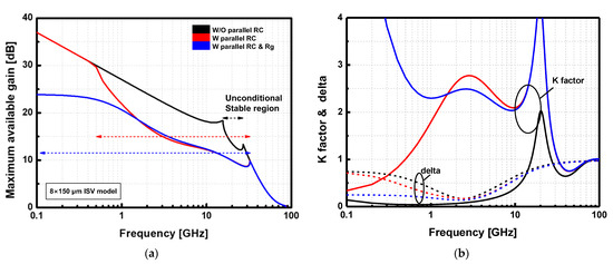 (a) Maximum available gain and (b) k factor (solid lines) and delta (dash lines) of stabilization cell with 8 × 150 μm device with different adoption of stabilization networks.