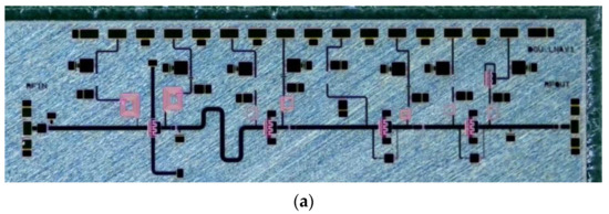 The implemented DA was designed with ISV-type HEMTs to minimize the parasitic degeneration inductance from the via to the ground. To achieve a wide range of linear regions, the size of the device at the final stage (M2) was chosen to be 8 × 150 μm, which makes Psat surpass 32 dBm. To keep the liner region from large input power and reduce the gain distortion within the operating power range, the size of the device at the final stage (M1) was selected to be 8 × 75 μm, resulting in the gate periphery ratio of 1:2. The input and output impedance was matched to 50 Ω considering the standalone measurement of each block and feasibility of the different compositions of MMIC blocks. The matching networks were comprised of capacitors and T-lines instead of inductors considering the reduction of the loss and modeling accuracy at the X-band.