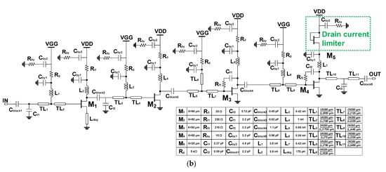 Different from the GaN LNA, a succeeding CMOS multi-function chip (MFC) can be seriously damaged even with 1 W power, which necessitates limiting the output power level of the LNA. By reducing the size of the final stage transistor, the control output power seems to be easy; however, a decrease in the size is limited to the specific design rule and aggravates the output impedance matching transformation ratio, which leads to the reduction of the bandwidth. To control the output power of the LNA and protect a succeeding silicon-based block, a diode-connected load was used at the final stage as shown in Figure 10b. The size of the limiter was carefully chosen considering the trade-off between the small signal gain reduction and the output power level control of the final stage. The output power of the LNA with the drain limiter was alleviated to 24 dBm.