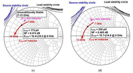 The optimum noise impedance (Znopt) of the selected device with 6 × 50 μm gate width is simulated as shown in Figure 11a. As illustrated in Figure 11b through Figure 11d, the degeneration inductance should be carefully selected to guarantee the unconditional stability that was achieved with Ldeg = 175 pH.