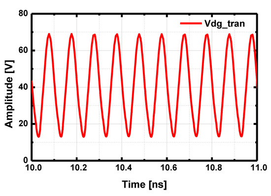 For a GaAs LNA, the first stage of the LNA can be easily damaged from excessive RF input power, which necessitates a limiter for a robust Rx chain. To implement a GaN LNA without any input protection circuit, the designed LNA introduced a high gate resistor in the path of the gate bias line to reduce the gate leakage current from the high voltage swing at the gate by effectively lowering the gate bias voltage from the voltage drop of the gate resistor from the leakage current [20]. Figure 12 presents the drain-gate voltage of the first stage HEMT with Pin = 38 dBm (100 μs of pulse width and 10% of duty-cycle). The breakdown voltage of the gate-drain junction (VBDG) is 120 V in the PDK.