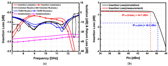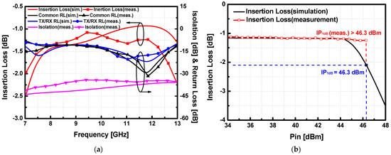As shown in Figure 14a, the measured insertion loss of SW-B achieved 0.66 dB at 9 GHz and less than 1.5 dB in the whole X-band. Even though the trend of S-parameters was slightly shifted to the low frequency due to the capacitive loading effect of the shunt transistors, the insertion loss of SW-B was better than SW-A as additional lossy inductors were eliminated. The measured SW-B achieved the insertion loss below 1 dB (0.66 dB at 9 GHz) within 3.7 GHz (7.8–11.2 GHz). The improvement of the insertion loss demonstrates that the 500 Ω resistor at the gate control path does not affect the performance of the switch from the gate voltage drop. The measured return loss of the proposed SW-B was better than 10 dB in the whole X band, which corresponded well with the simulation results. The isolation of the switch was better than 35 dB within the whole X-band. SPDT T/R switch version-B demonstrates comparably high linearity with the IP1dB larger than 44.7 dBm at 9 GHz as shown in Figure 14b.