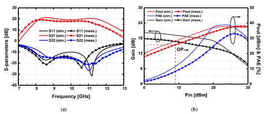 Simulated and measured (a) S-parameters result and (b) large-signal performance at 9 GHz of the driving amplifier under RF pulsed conditions with 100 μs of pulse width and 10% of duty cycle.