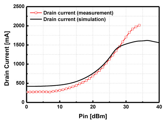 The measured drain current was not saturated, while the simulated drain current was saturated at the output power saturation point. The discrepancy of the drain current between the simulation and measurement mainly resulted in the degradation of the peak PAE compared with that in the simulation.